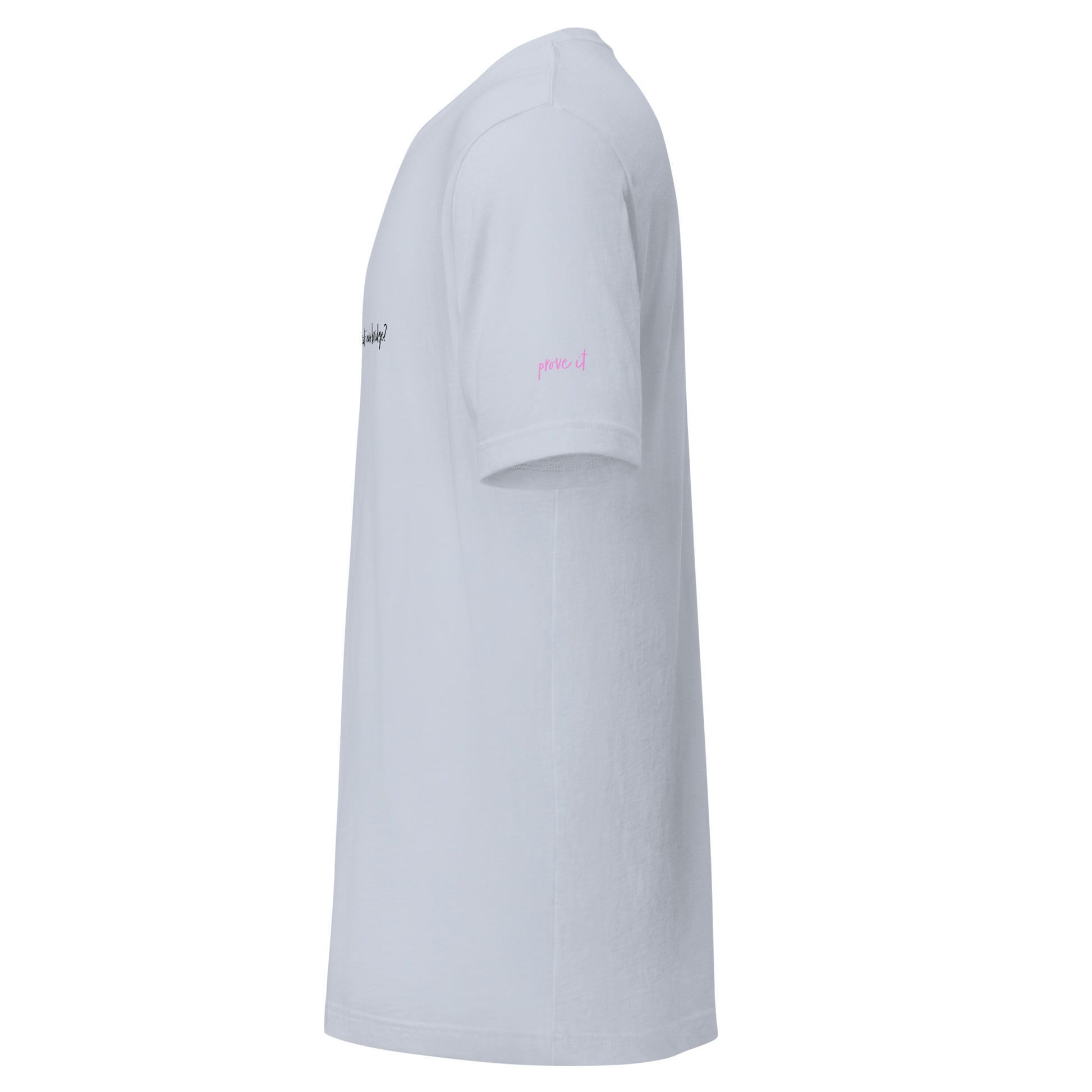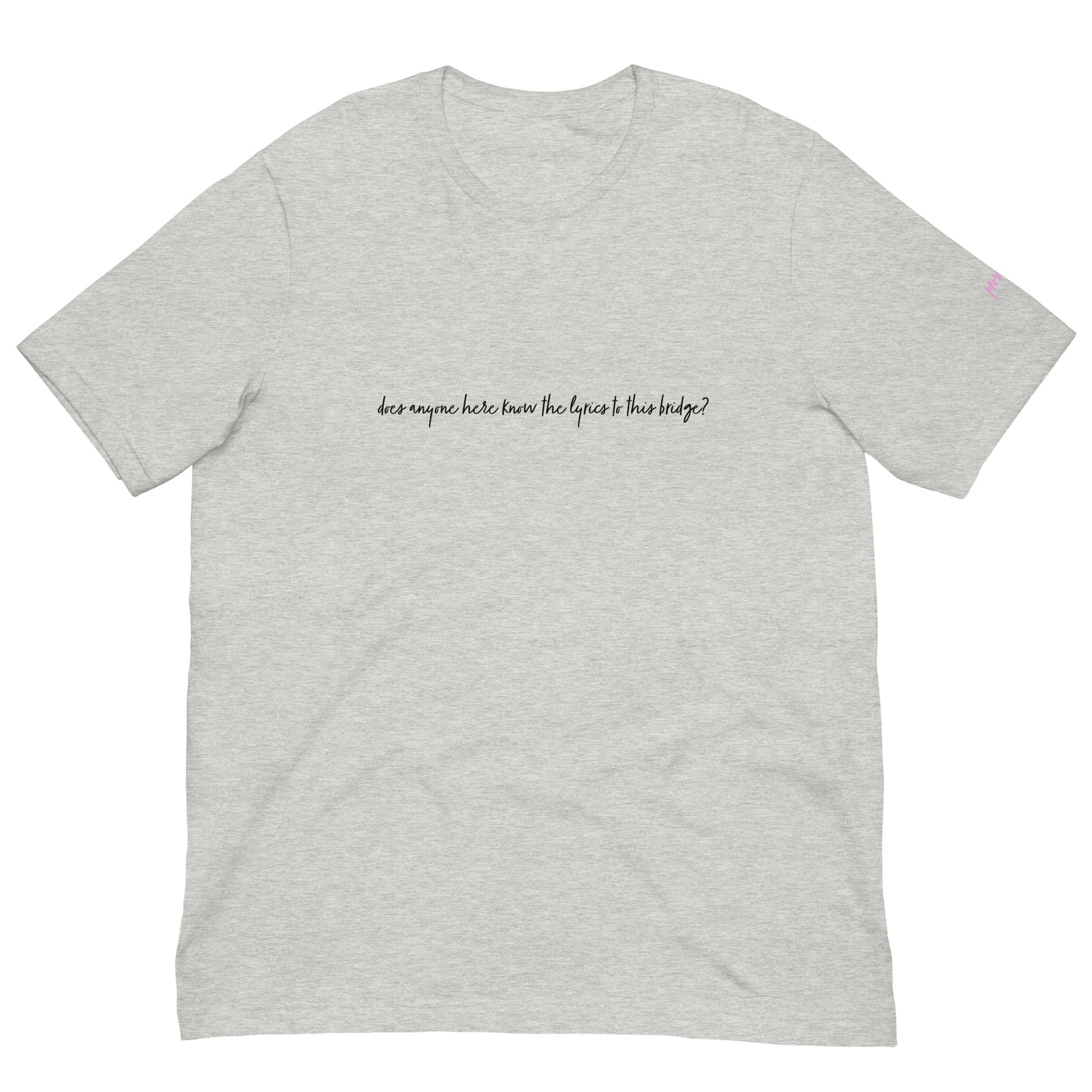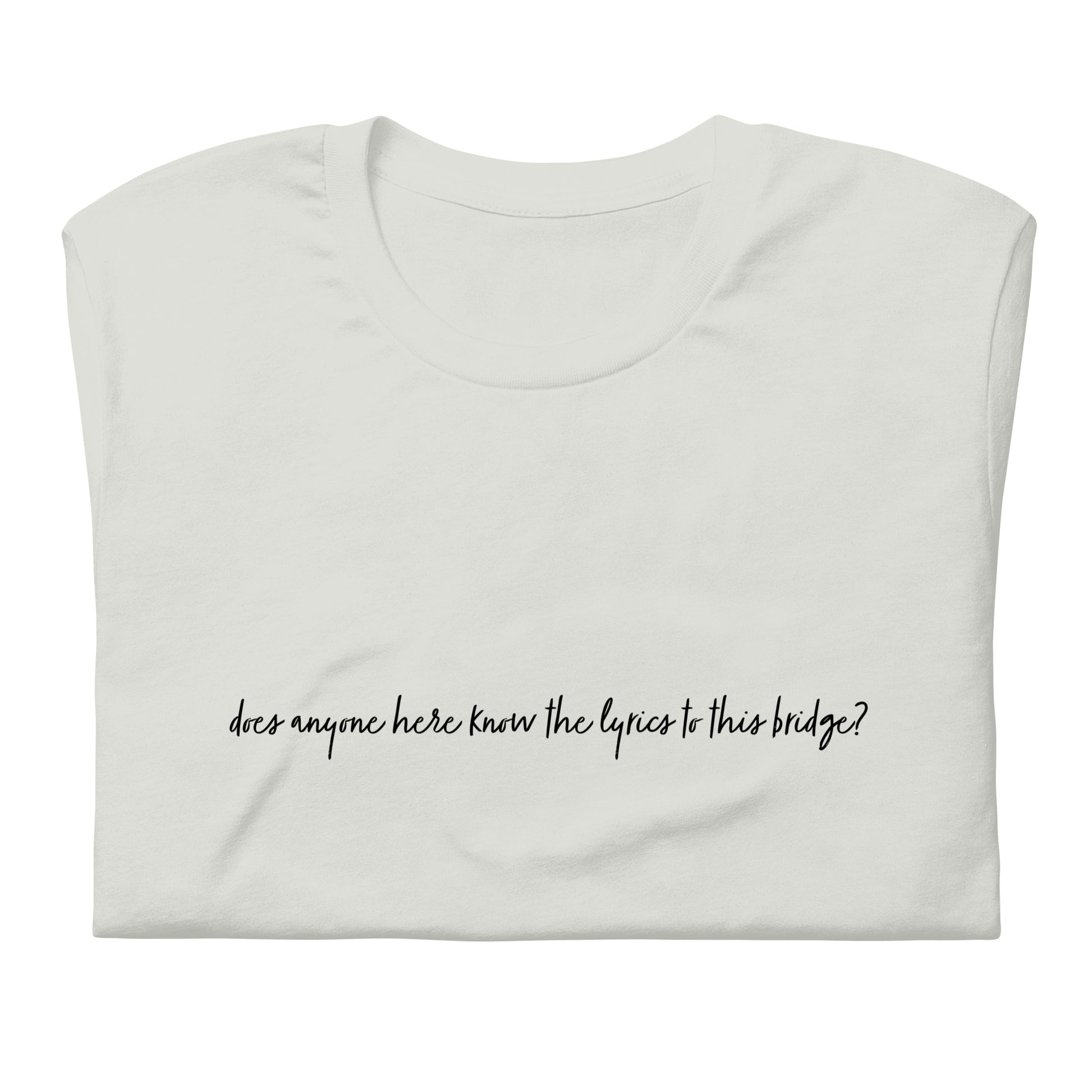 Inspired by the Lover album this tee features Taylor's famous line from the Lover era, "Does anyone here know the lyrics to this bridge?" graphic across the front. And "Prove it" in a pink font on the sleeve. Available in a range of sizes, it offers a unisex, flattering fit for everyone. Pair it with your favourite denim shorts or a flowy skirt for a laid-back look that celebrates your love for music and style.