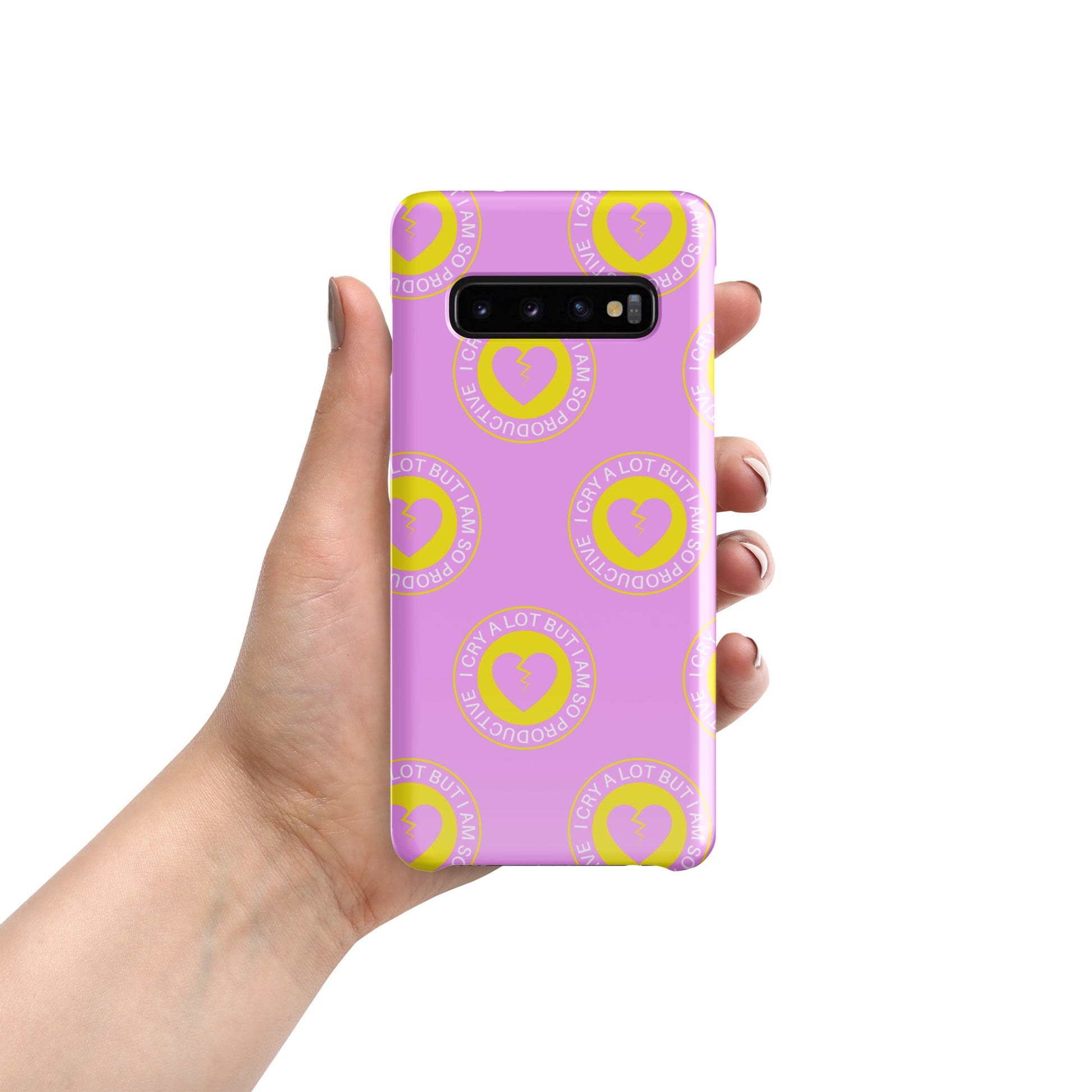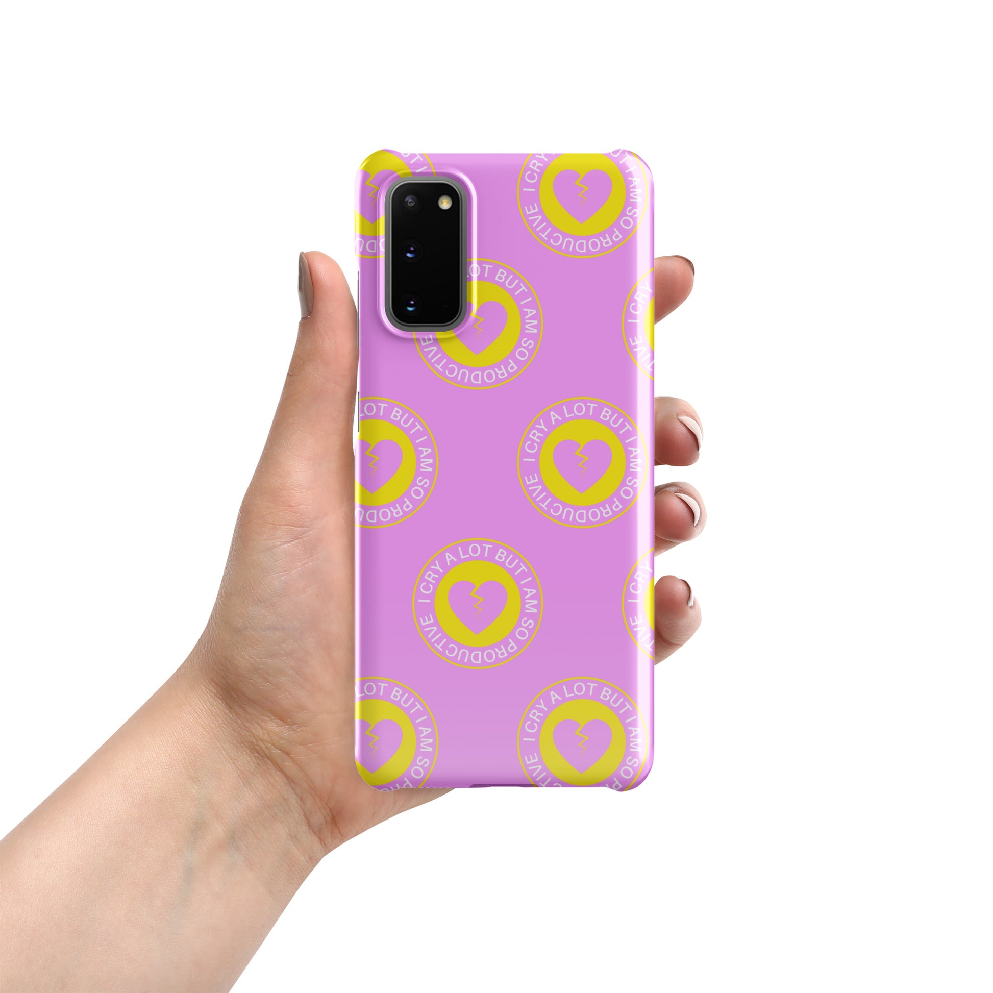 In your broken heart era? This Samsung case features a playful pink and yellow pattern, with our "I Cry A Lot But I Am So Productive" design. It's the perfect not-so-subtle nod to Swifties, that also helps protect your Samsung phone.